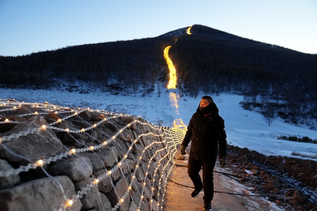 12月30日,工作人員在崇禮長城景觀展示亮化工程現(xiàn)場巡查。新華社記者 楊世堯 攝