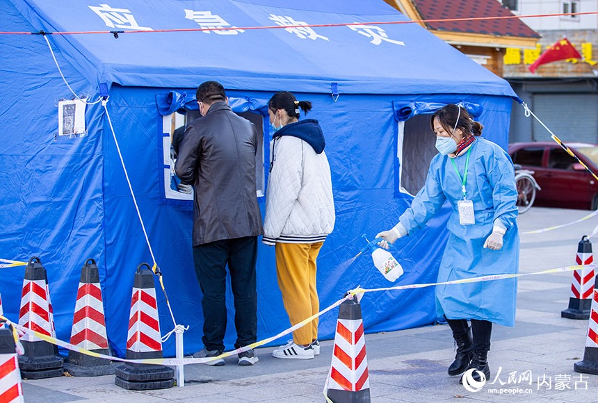 呼和浩特市玉泉區(qū)一處核酸篩查點,社區(qū)工作者對核酸采樣現(xiàn)場進行消殺。丁根厚攝