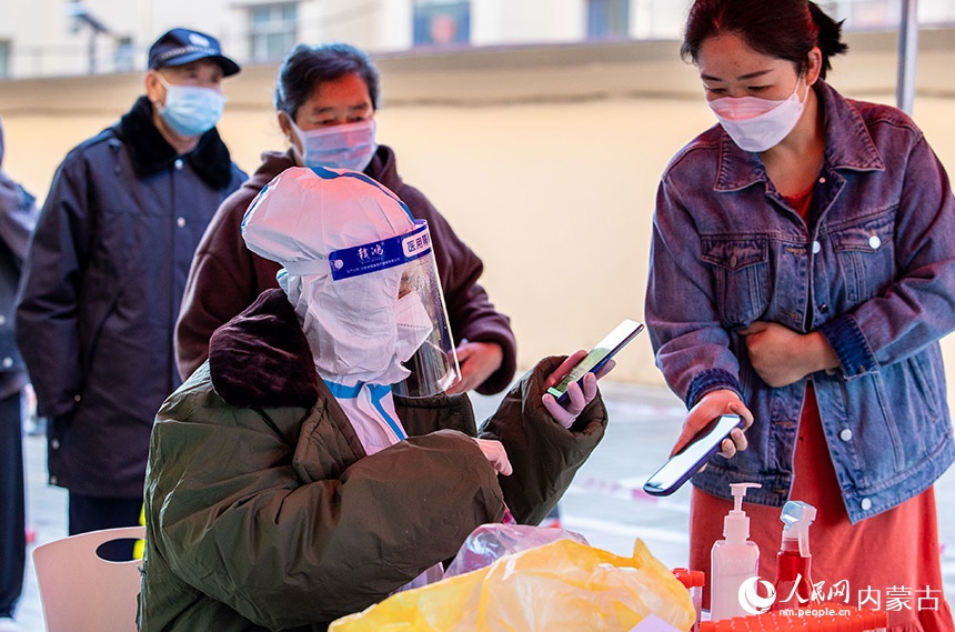 呼和浩特市玉泉區(qū)一處住宅小區(qū),社區(qū)網格員在查驗準備去核酸檢測點居民的健康碼。丁根厚攝