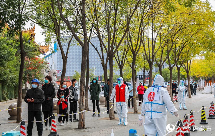 呼和浩特市玉泉區(qū)一處核酸采樣點,醫(yī)護人員為居民進行核酸檢測。丁根厚攝