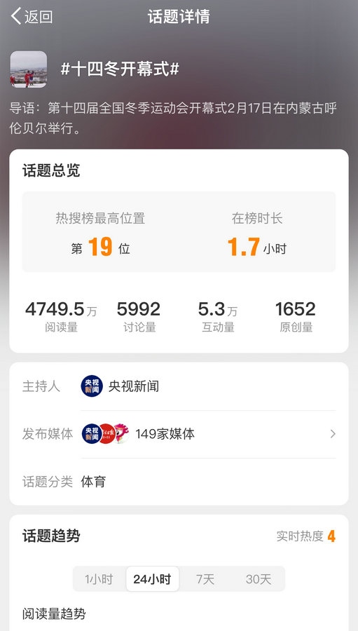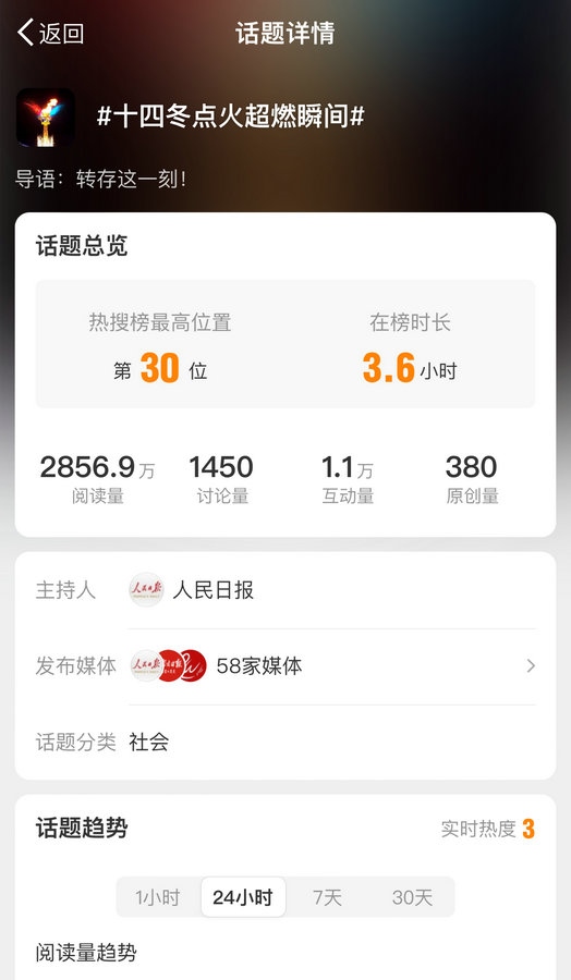 國內(nèi)多家主流媒體對開幕式進(jìn)行報道,話題#十四冬開幕式# #十四冬點火超燃瞬間#等話題登上微博熱搜榜,閱讀量近8000萬。