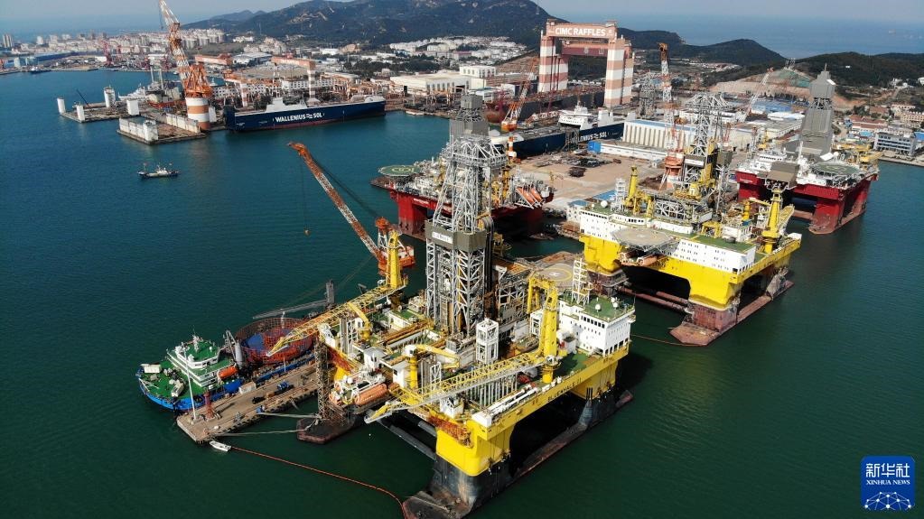 “藍鯨1號”(前右)及姊妹平臺“藍鯨2號”(前左)在其生產基地中集來福士海洋工程有限公司煙臺基地進行維護和保養(yǎng)(2021年10月18日攝,無人機照片)。新華社記者李紫恒攝