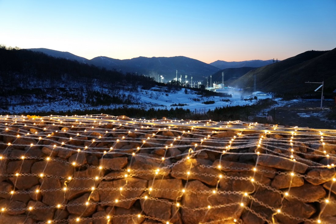 這是12月30日拍攝的崇禮長城景觀展示亮化工程現(xiàn)場,遠(yuǎn)處為國家越野滑雪中心(無人機(jī)照片)。新華社記者 牟宇 攝 -
